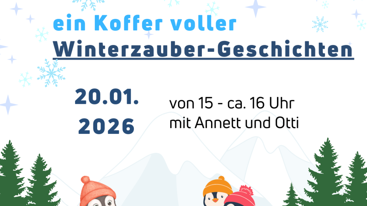 Vorgelesen wird am 20.01.26 von 15.00 - ca. 16.00Uhr und der Geschichtenkoffer hat wieder Bücher vom Winter mitgebracht. Wir bitten um Anmeldung in der Bücherei oder per Mail kramsach@bibliotheken.at (für eine bessere Planung).