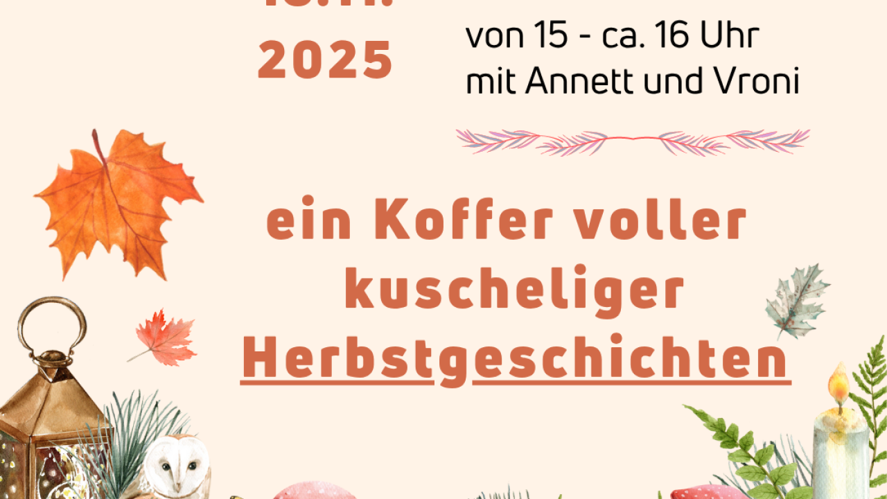 18.11.2025 herbstlicher Geschichtenkoffer am 18.11. ab 15.00 bis ca 16.00 Uhr tauchen wir wieder in der Bücherei in Geschichten ein herbstlicher Geschichtenkoffer Wind, Schneeregen und schlecht Wetter - kommt zu uns in die Bücherei und lasst euch vorlesen mit Annett und Vroni - um Anmeldung wird geben