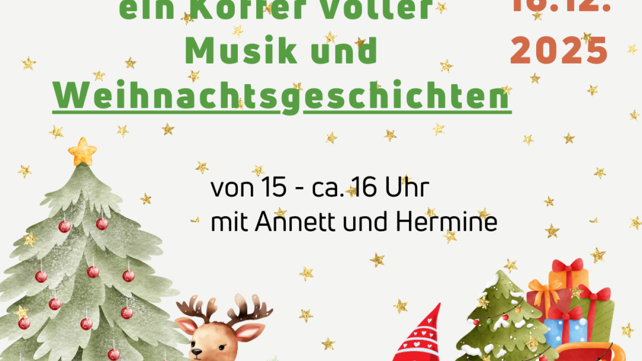 16.12.2025 Weihnachtlicher Geschichtenkoffer am 16.12. ab 15.00 bis ca 16.00 Uhr tauchen wir wieder in der Bücherei in Geschichten ein Geschichtenkoffer Kling Glöckchen Klingelingeling - kommt zu uns in die Bücherei und lasst euch vorlesen mit Annett und Hermine - um Anmeldung wird gebeten