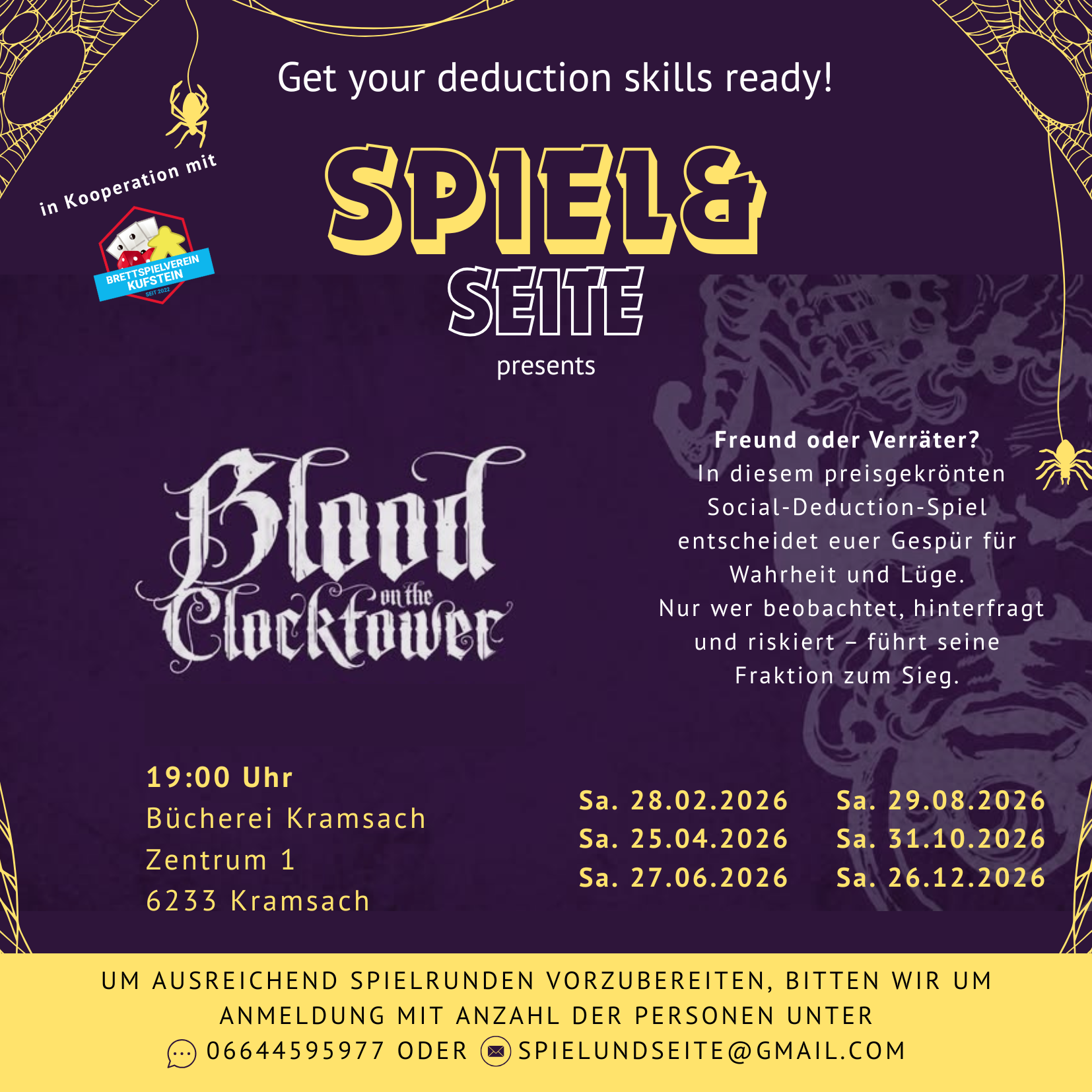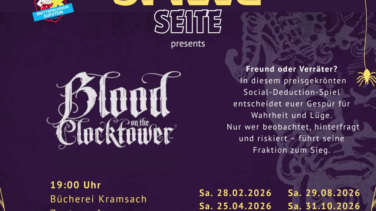 Am 28.02.26 ab 19.00 Uhr wird wieder gespielt, gespielt, gespielt - diesmal Blood on the Clocktower - Anmeldung unter 06644595977 oder spielundseite@gmail.com