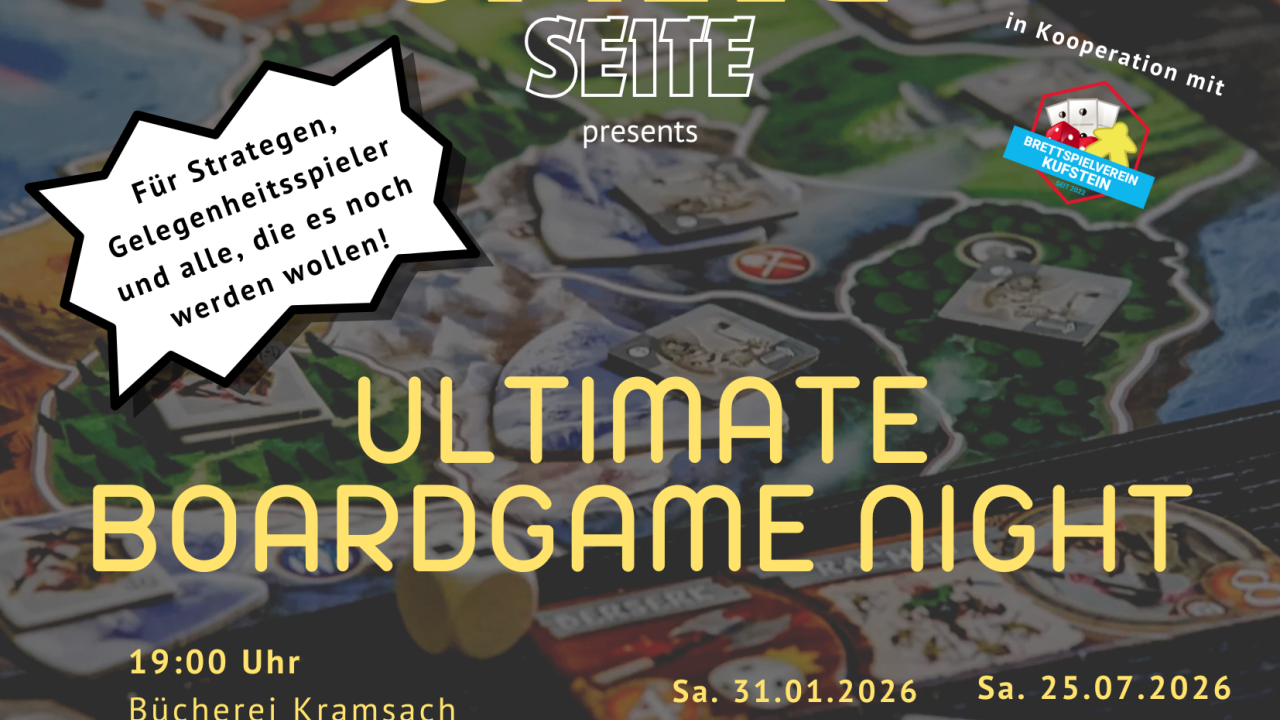 Unser ultimative Brettspielabend ist wieder am 31.01.26 in der Bücherei. Kommt vorbei, lernt neue Spiele, neue nette Leute kennen und habt Spaß!